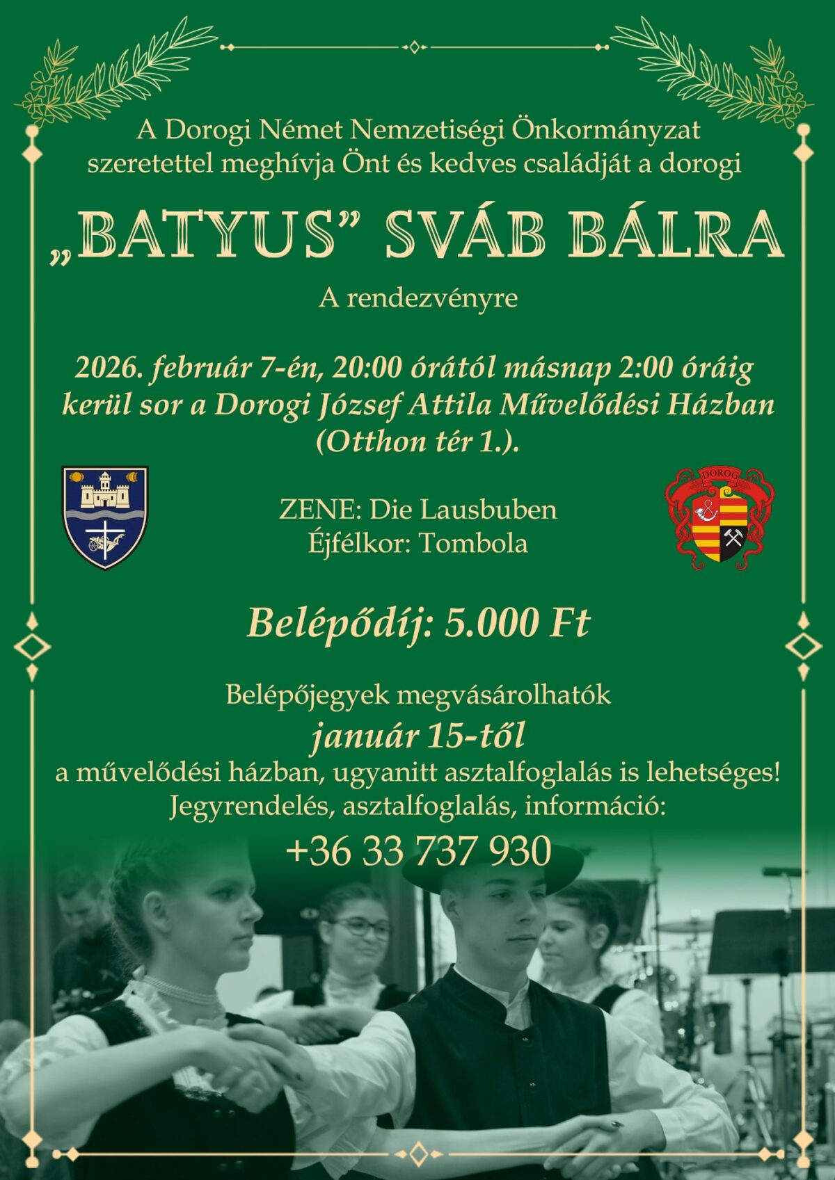 A Dorogi Német Nemzetiségi Önkormányzat szeretettel hívja és várja az érdeklődőket a „Batyus” sváb bálra, amelyet 2026. február 7-én, szombaton rendeznek meg Dorogon.