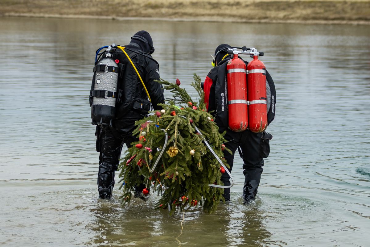 A Palatinus-tó mélyére vitték a feldíszített és fényfüzérrel díszített karácsonyfát