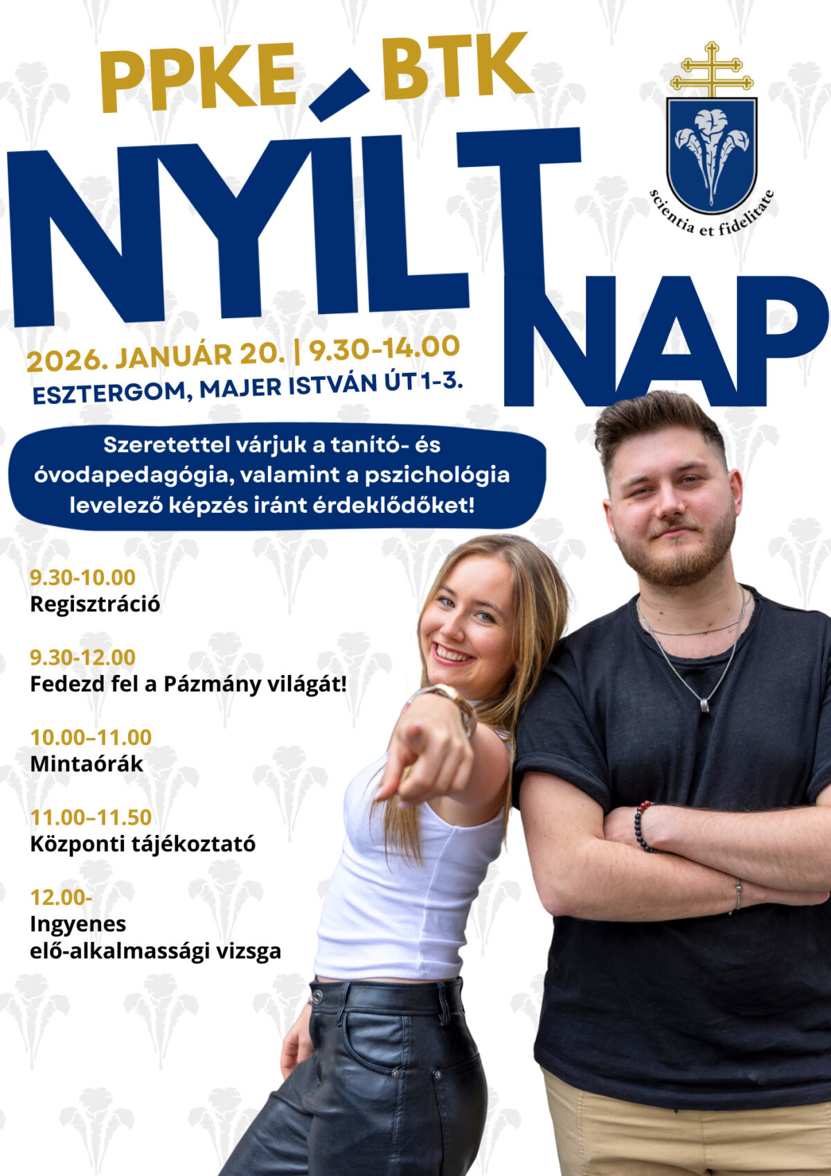 Nyílt napot rendez a Pázmány Péter Katolikus Egyetem Bölcsészet- és Társadalomtudományi Kara 2026. január 20-án, kedden Esztergomban. Az eseménynek az Iohanneum ad otthont (Majer István út 1–3.), ahol 9.30 és 14.00 óra között várják az érdeklődőket.