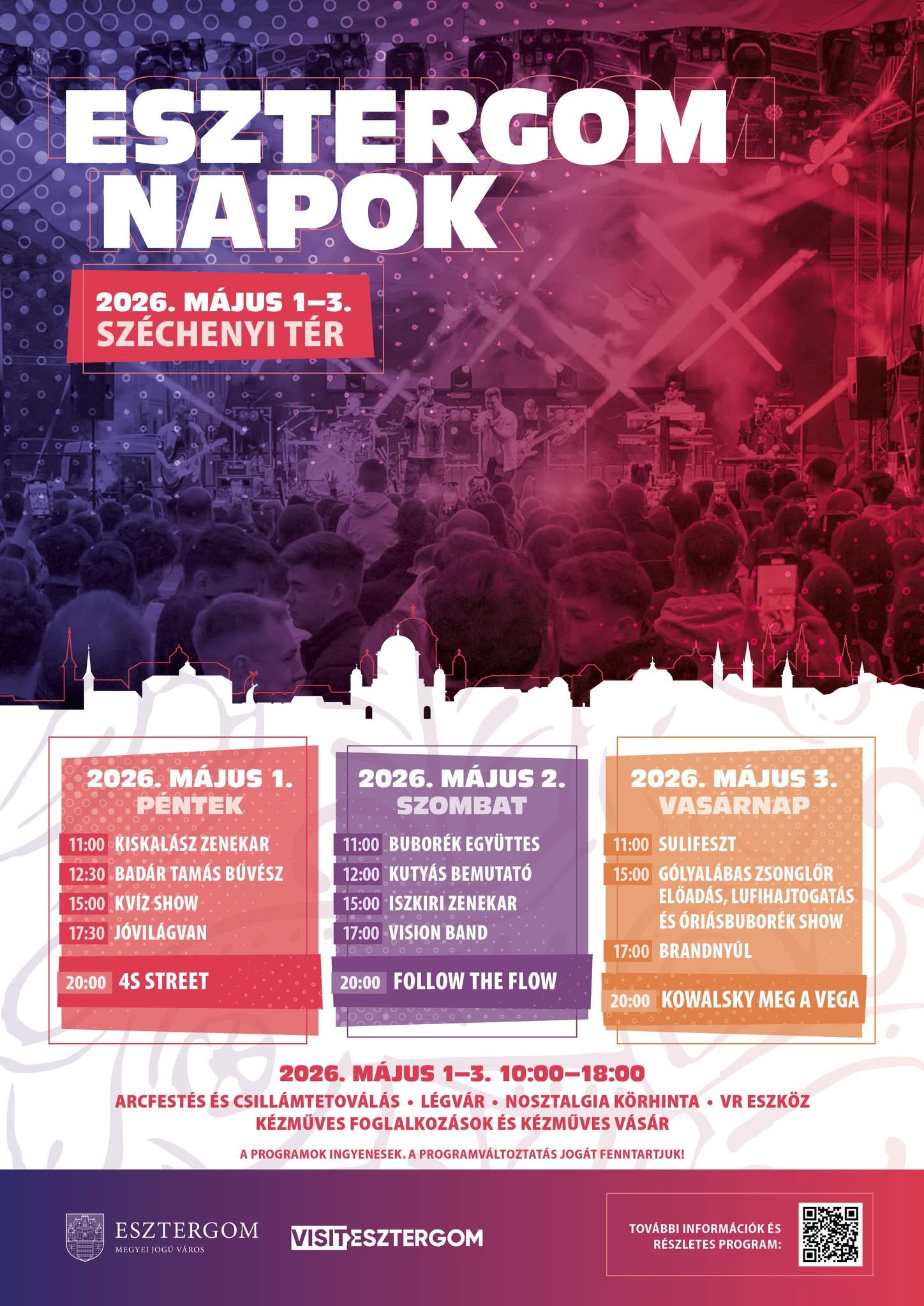 Idén május elseje nemcsak a pihenésről, hanem a pezsgő közösségi életről is szól! 2026. május 1. és 3. között Esztergom szíve, a Széchenyi tér megtelik zenével, vidámsággal és családi programokkal.