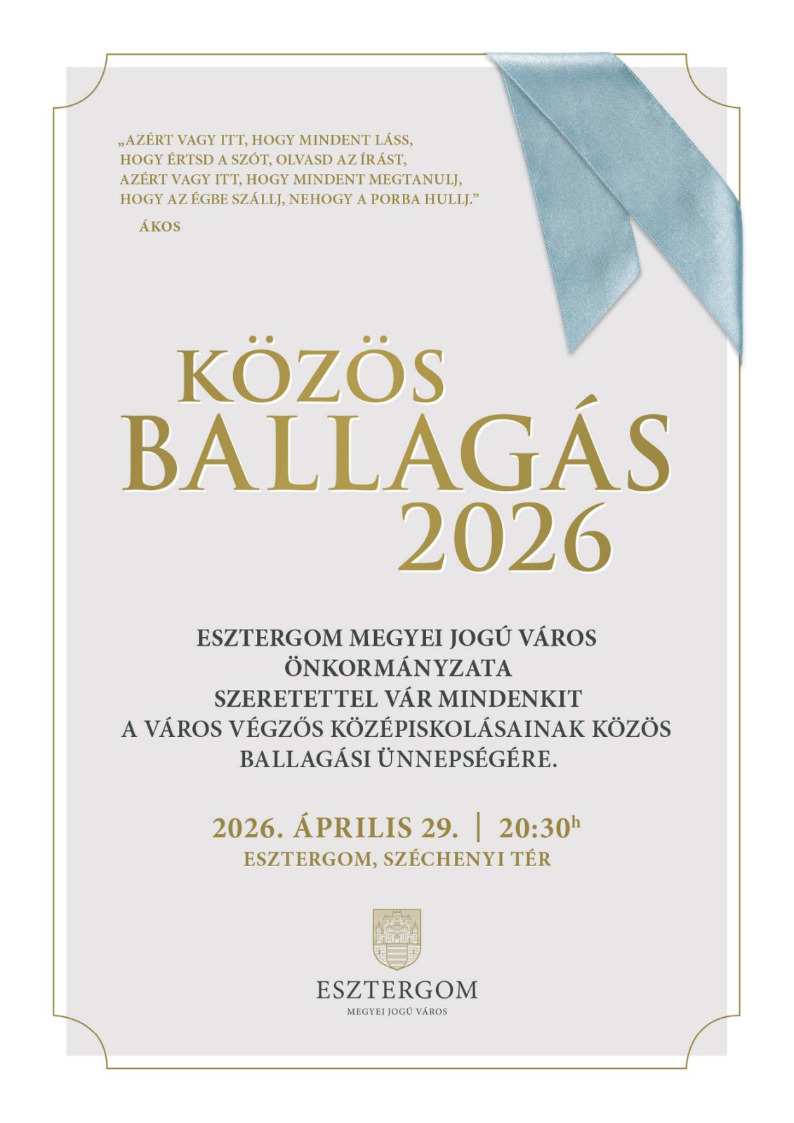 Esztergom Megyei Jogú Város Önkormányzata 2026. április 29-én, 20 óra 30 perckor tartja Városi közös ballagását a Széchenyi téren.