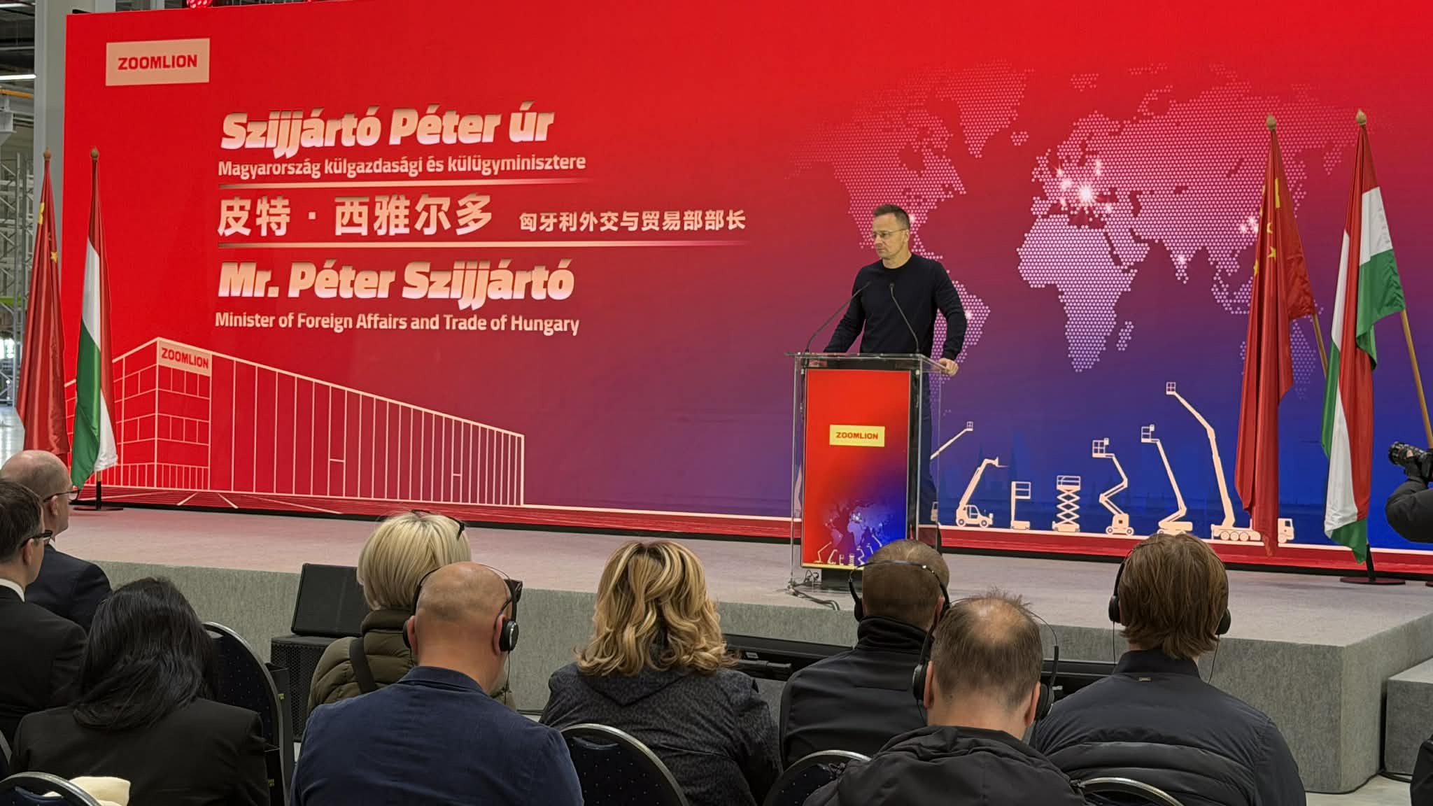 Dr. Ren Huili, a Zoomlion alelnöke és a Zoomlion Access ügyvezetője beszédében részletesen ismertette a globális nagyvállalat működését és jövőbeli terveit. Kiemelte, hogy a tatabányai gyár megépítése szorosan összefügg a kiváló magyar-kínai politikai és gazdasági kapcsolatokkal, amelyek stabil alapot biztosítottak a beruházásnak.