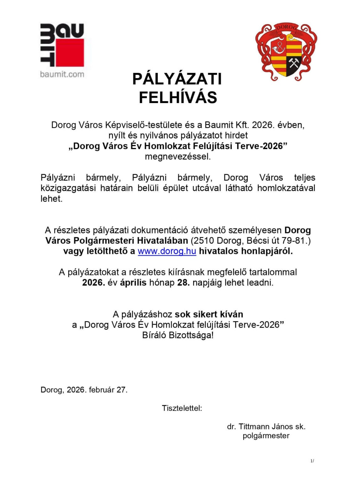 A pályázatokat a részletes kiírásnak megfelelő tartalommal 2026. április 28-ig lehet benyújtani. A Bíráló Bizottság sok sikert kíván a jelentkezőknek. A felhívást 2026. február 27-én írta alá dr. Tittmann János polgármester.